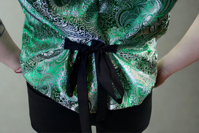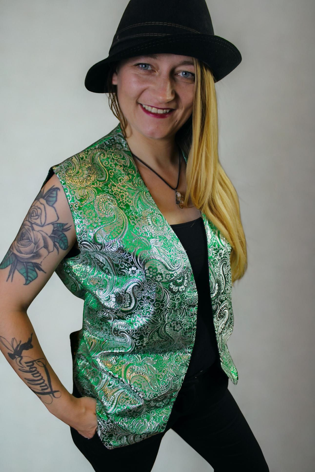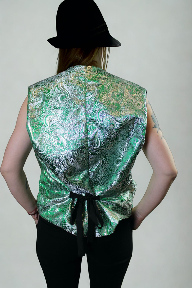 This unique vest is the centerpiece of any outfit. Nothing more is needed – layer it over a simple base and let it shine. The intricately woven jacquard creates a luxurious look, while the hand-finished cotton lining ensures comfort. My studio has created only one of these pieces, with originality and boldness in mind.