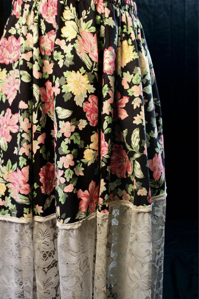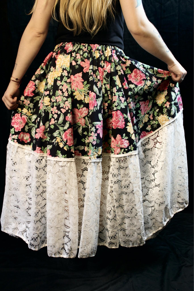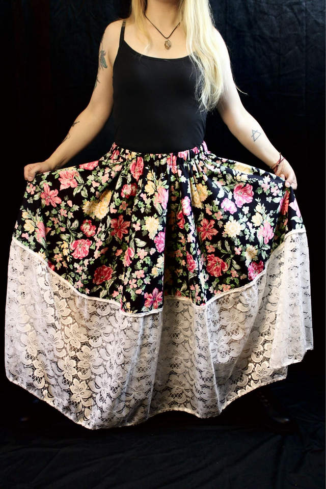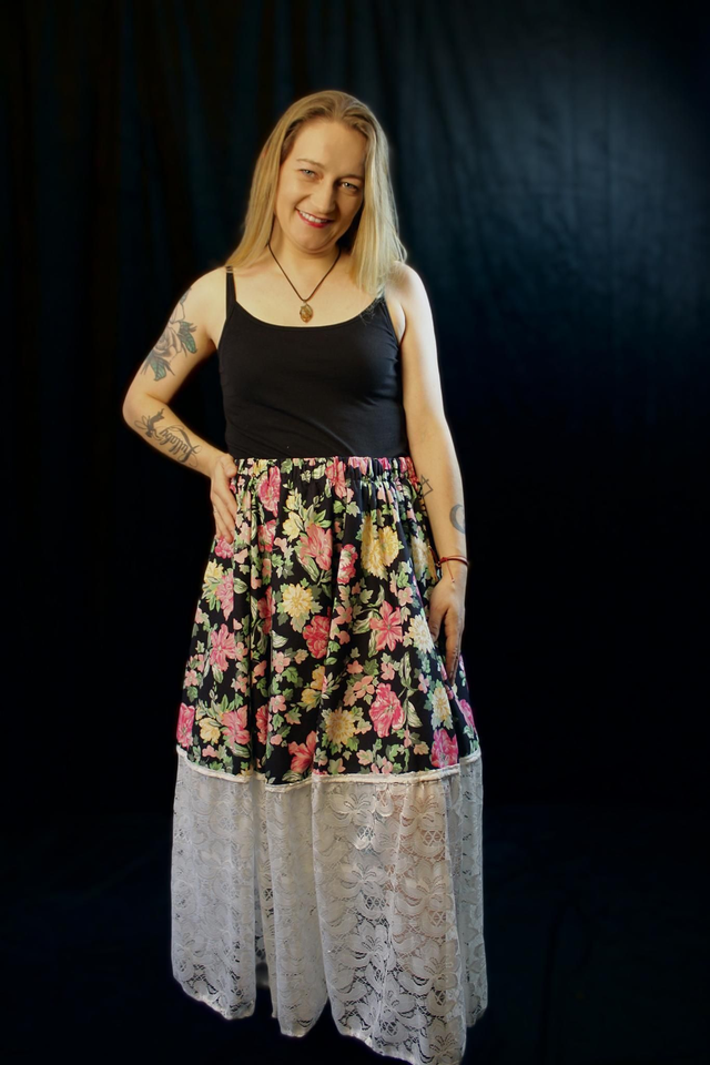 This beautiful skirt was created from the heart... It embodies a romantic soul, and its pastoral character adds an irresistible charm. All materials are recycled, proving that beauty can be ethical, sustainable, and unique, because you won't find another like it. It's an artistic skirt, but you can easily wear it every day, exuding irresistible charm. To live as if every day were a celebration!