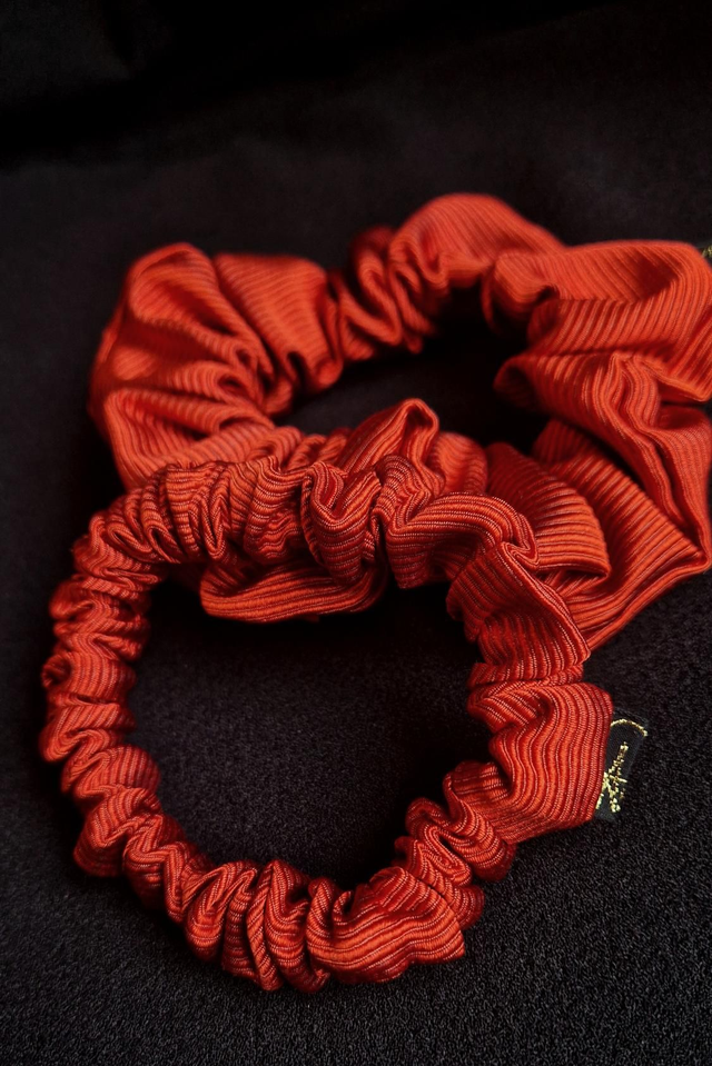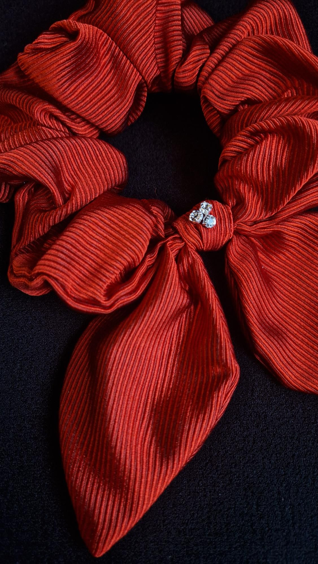 A luxurious set of three scrunchies made of high-quality silk. Each scrunchie is handcrafted. The fabric is densely woven, and the light it reflects is impressive. The largest scrunchie is adorned with a ribbon embroidered with Original Swarovski Crystals Chaton Montees — each crystal individually. The other two scrunchies are less ornate to balance the craftsmanship and allow for the right accessory for the occasion.